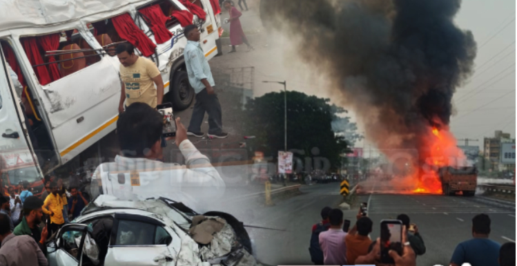 சம்பவம் பதிவான காணொளிகளில், ஒரு லொறிகள் தீப்பிடித்து எரிவதைக் காணலாம், அதே நேரத்தில் புகைப்படங்கள் லொறிகளுக்கு இடையில் சிக்கிக்கொண்ட சிதைந்த காரைக் காட்டுகின்றன.