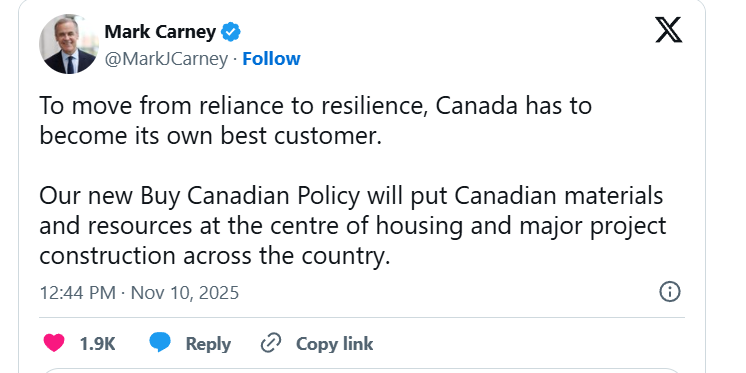எங்கள் புதிய Buy Canada கொள்கை, நாடு முழுவதும் வீட்டுவசதி மற்றும் பெரிய திட்ட கட்டுமானத்தின் மையத்தில் கனேடிய பொருட்கள் மற்றும் வளங்களை வைக்கும்” என  குறிப்பிட்டுள்ளார்.