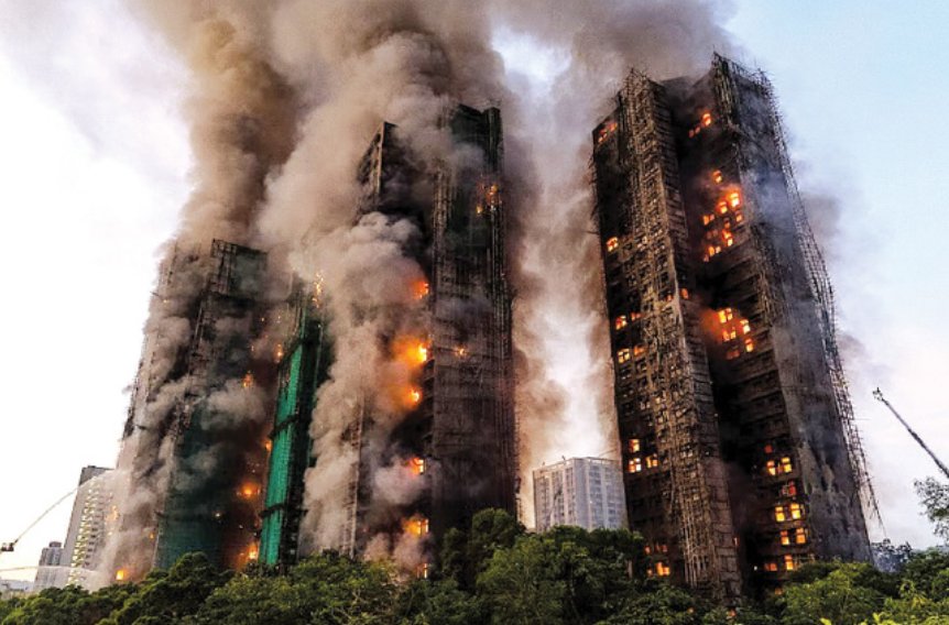 இந்நிலையில், கட்டட புதுப்பிக்கும் பணிக்காக கட்டப்பட்ட மூங்கில் சாரங்கள் மற்றும் வலைகளில் நேற்று முன்தினம் திடீரென தீப்பற்றி பயங்கர விபத்து ஏற்பட்டது. இந்த தீ, அருகில் இருந்த ஏழு கட்டடங்களுக்கும் பரவியதால், அங்கிருந்த மக்கள் அலறியடித்தபடி ஓடினர். உயரமான தளங்களில் வசித்தவர்கள் வெளியேற முடியாமல் சிக்கினர்.
