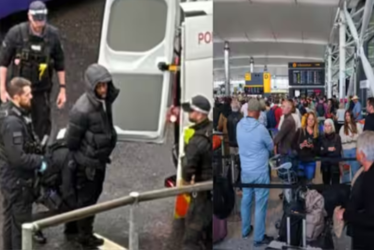 லண்டனின் புறநகர்ப் பகுதியில் உள்ள டெர்மினல் 3 கேரேஜில், நான்கு ஆண்கள் கொண்ட குழு, ஒரு லிஃப்டில் இருந்த ஒரு பெண்ணின் சூட்கேஸைத் திருடி, எரிச்சலூட்டும் பொருளை அவர் மீது தெளித்ததாக தெரிவிக்கப்படுகின்றது.