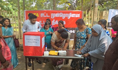 பயங்கரவாதத்தில் இருந்து அரசை பாதுகாக்கும் சட்ட வரைபுக்கு எதிராக மக்களின் கருத்தை திரட்டி நீதி அமைச்சுக்கு அனுப்பும் நடவடிக்கை யாழ்ப்பாணத்தில் முன்னெடுக்கப்பட்டது. யாழ்ப்பாணப் பல்கலைக்கழக பிரதான நுழைவாயில் முன்பாக இன்று...